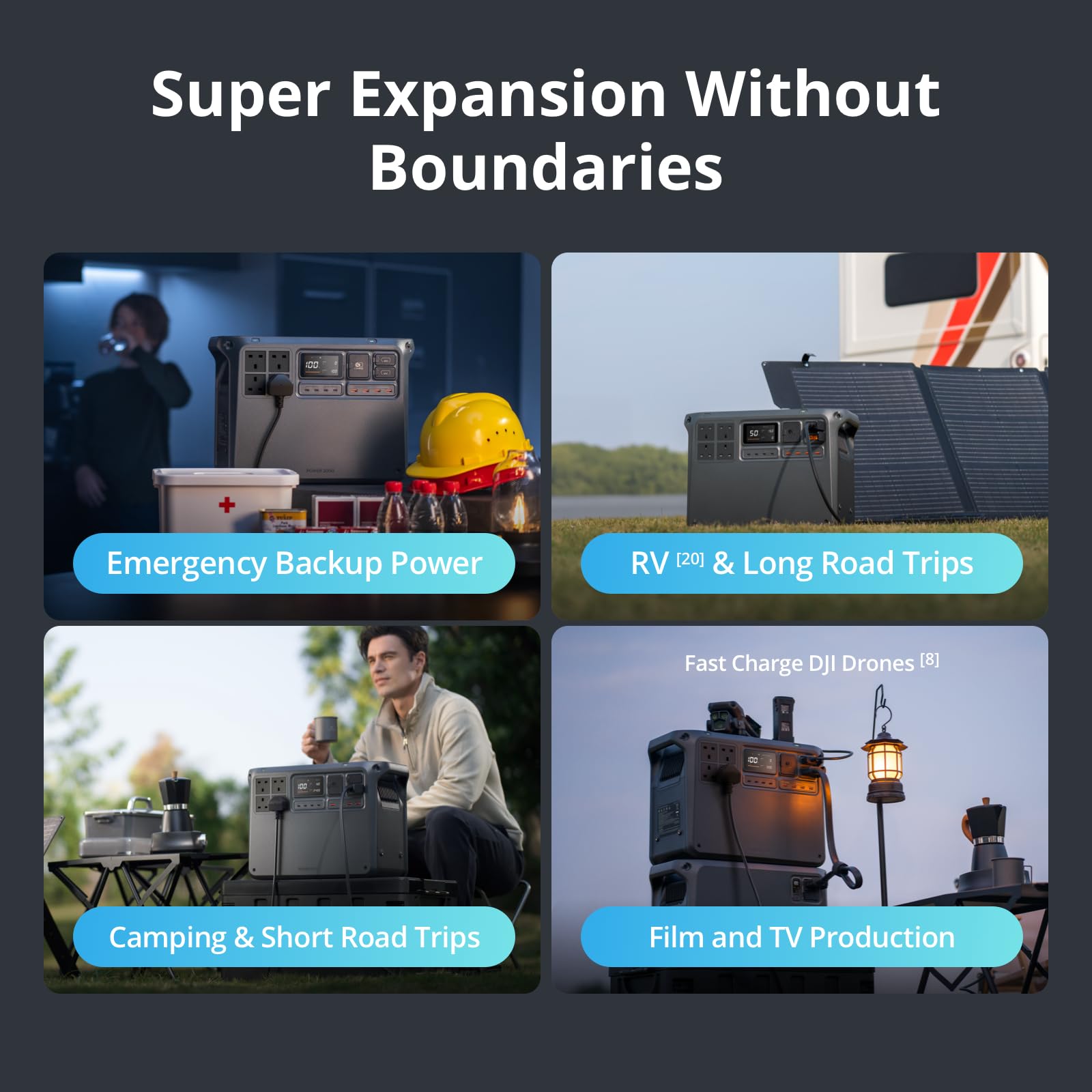 - Extended Backup, Anytime - DJI Power 2000 supports expansion up to 22.5kWh*—enough to power essential home devices for 4–6 days during blackouts, storms, or off-grid living. * Requires expansion batteries, which are sold separately.