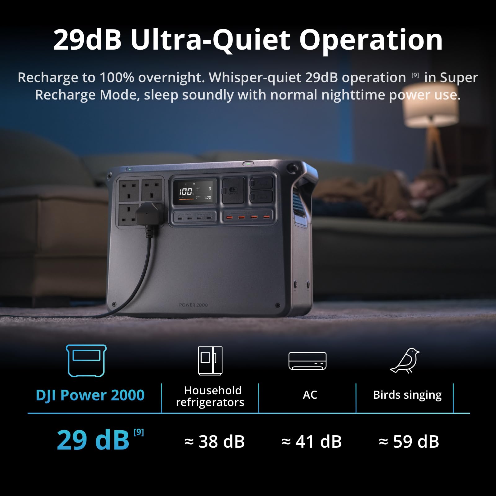 - Quiet Comfort for Restful Nights - DJI Power 2000 runs as low as 29 dB, reducing noise during nighttime use in RVs or camper vans—sleep undisturbed when charging devices in enclosed spaces.