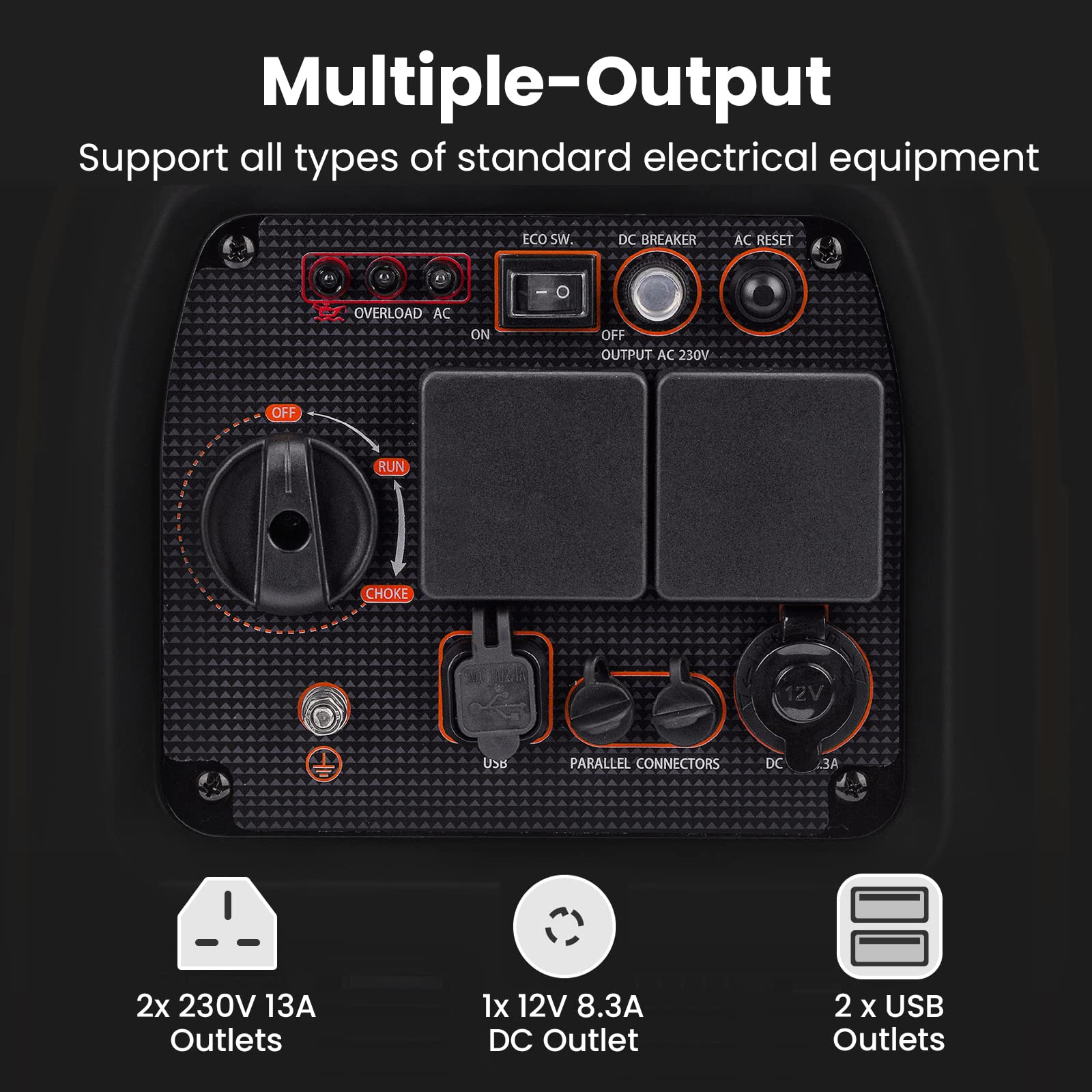 - 【Multifunction Power Supplier】 Quiet and fuel efficient 4 stroke 145cc petrol generator produces 3300W max watts and 3000W running watts. It is easily able to run the lighting system, RV or a small family home. And run a huge range of high-power appliances such as an air conditioner with 6000 BTU cooling capacity, refrigerators, kettles, and even more appliances at the same time.